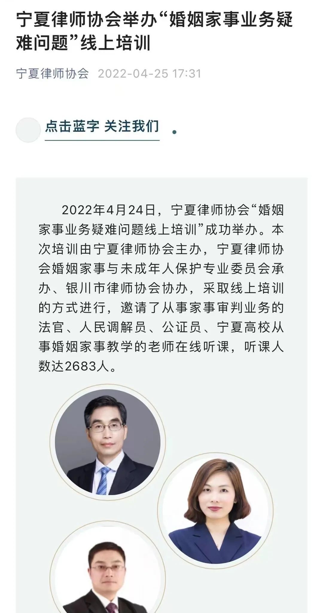 宁夏律师协会本次“婚姻家事业务疑难问题”线上培训活动邀请了从事家事审判业务的法官、人民调解员、公证员、宁夏高校从事婚姻家事教学的老师在线听课,听课人数达2683人。桂芳芳律师作为上海律协婚家委副主任,与广东省律协婚家委主任游植龙律师、江苏省律协民委会副主任孙韬律师一同作为本次线上培训活动的主讲人进行授课分享。