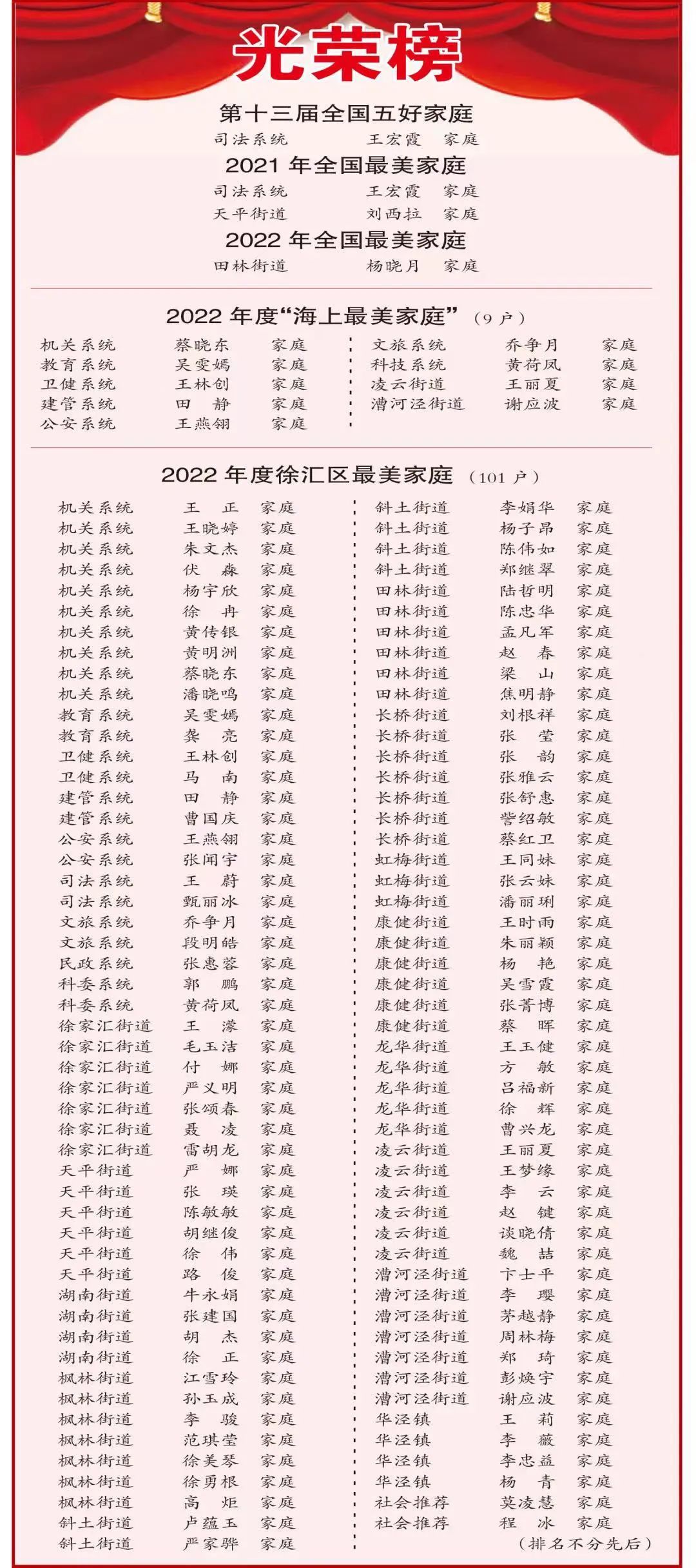 本届徐汇区家庭文化节对徐汇区涌现出的全国、市、区各级最美家庭进行了隆重表彰。今年,在徐汇区家庭文明建设协调小组成员单位支持下,各级妇联依托近400家“妇女之家”,通过晒、议、讲、展、秀等形式,以家庭全覆盖为目标,不断拓展延伸,在全区涌现出了一大批“最美”家庭,其中“全国五好家庭”1户,“全国最美家庭”2户、“海上最美家庭”9户、“徐汇区最美家庭”101户,这些家庭爱党爱国、绿色节俭、移风易俗、热心公益、投身抗疫、科学教子、孝老爱亲,是全区广大家庭身边可学可敬的榜样。