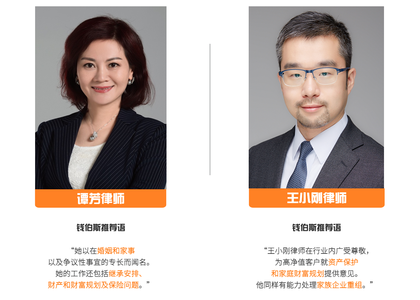 王小刚律师已连续多年被评为钱伯斯私人客户/财富管理业务中国法域第一级别(band 1)律师,谭芳律师亦连续六年蝉联钱伯斯该领域榜单。