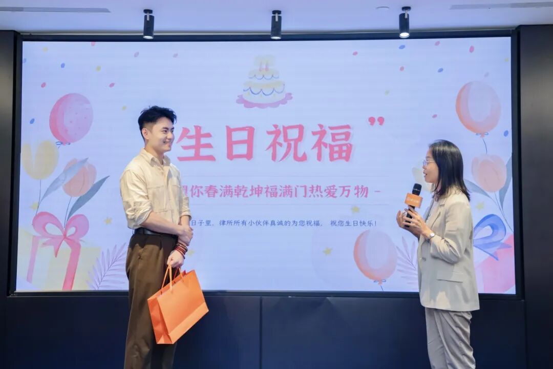 上海家与家律师事务所高级合伙人孟亚云律师作为代表为寿星送上礼物和祝福。孟亚云律师表示,在家与家特有的人才选用“五个YAN值”和人才培育“五大法宝”的培养下,越来越多青年律师在家与家的平台上发挥着重要的作用,与大家在案件头脑风暴的过程中也开拓了很多新思路。