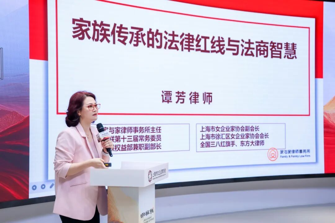上海市女企业家协会副会长、家与家律师事务所主任谭芳律师发表主题演讲。她凭借其多年深耕法律实务领域所积累的丰富经验,以《家族传承的法律红线与法商智慧》为题,为在场企业家深刻剖析了传承路上的法律风险,助力企业家明晰法律边界,运用法商智慧实现家族财富与事业的稳健传承。
