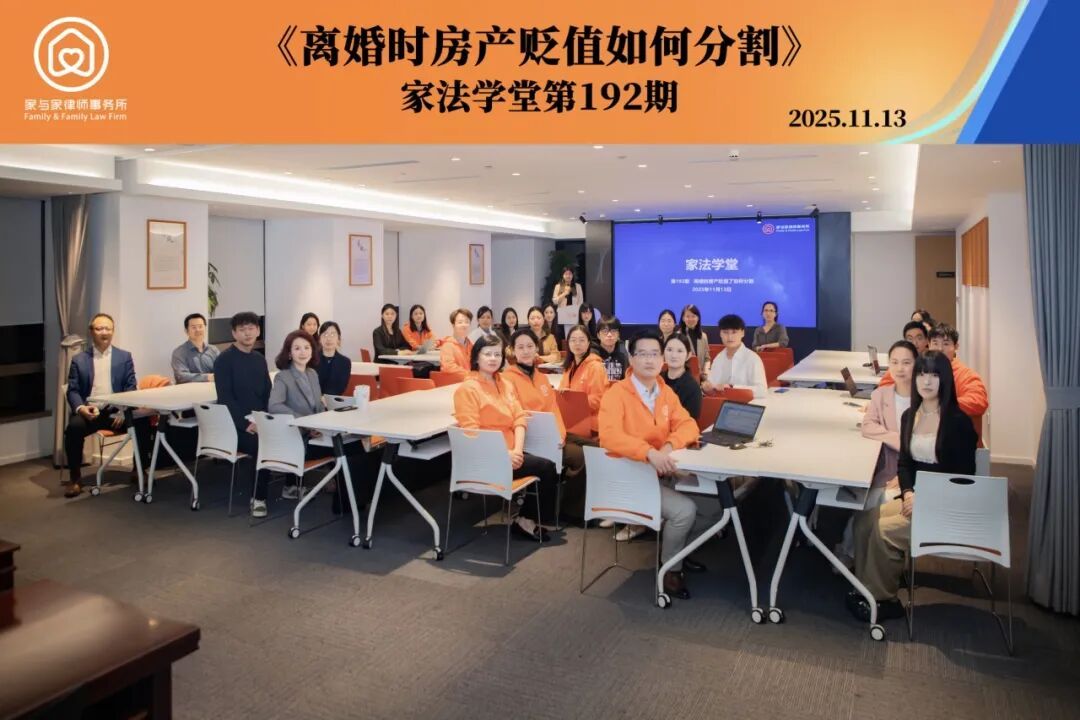 11月13日,上海家与家律师事务所开展第192期家法学堂活动。本次活动聚焦“离婚时房产贬值了如何分割”这一实务热点展开,主讲人为家与家律师事务所冀丹丹。