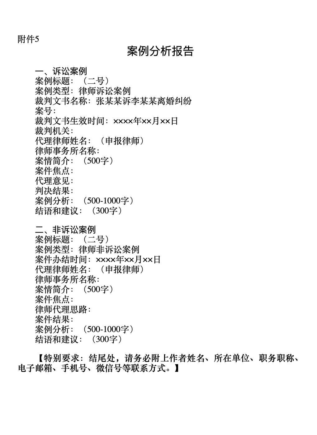 2.撰写《典型案例分析报告》(附件5,文末可下载),并提供相应的案件材料及裁判文书,包括:起诉状、上诉状、答辩状、代理词、裁决书和判决书(调解书)等法律文书电子版。在一审阶段生效的,应当提交案件的生效证明。