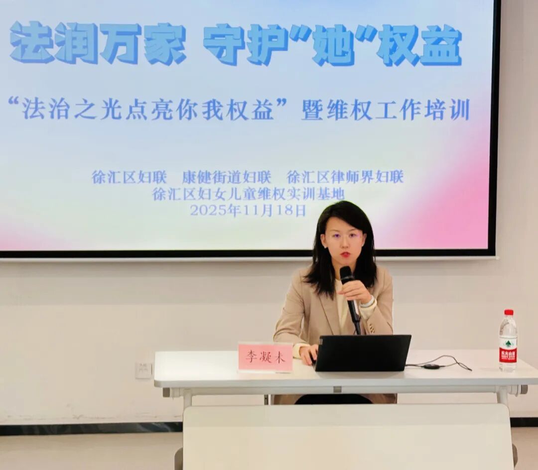 11月18日,国际消除对妇女暴力日前夕,上海律协调解专业委员会副主任、徐汇区妇女儿童维权实训基地负责人、上海家与家律师事务所副主任李凝未律师走进徐汇区龙华街道、康健街道,为居民区妇联主席、妇联干部以及片区妇联女性代表做维权专题分享。