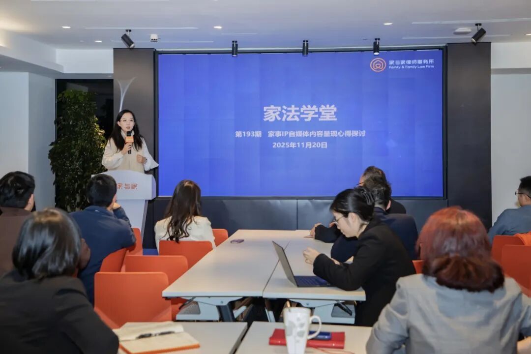 11月20日,上海家与家律师事务所开展第193期家法学堂活动。本次活动探讨“家事IP自媒体内容呈现心得”,主讲人为家与家律师事务所运营部邢鑫。