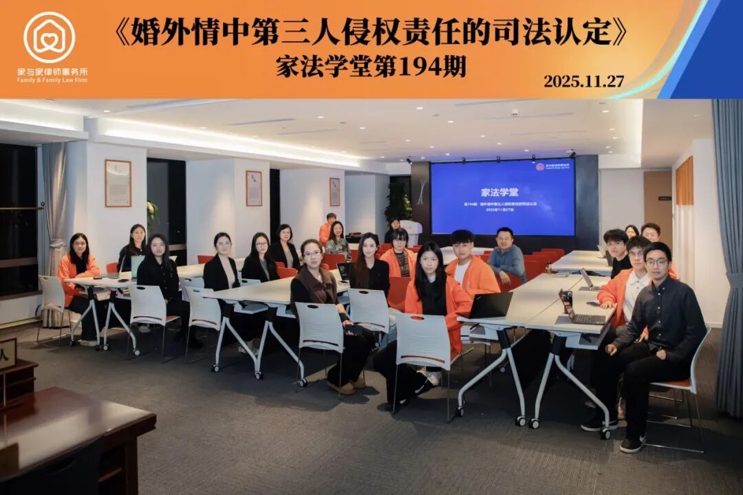 11月27日,上海家与家律师事务所开展第194期家法学堂活动。本次活动围绕“婚外情中第三人侵权责任的司法认定”展开,主讲人为家与家律师事务所宋佳政。