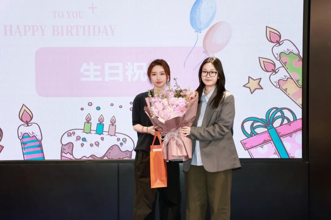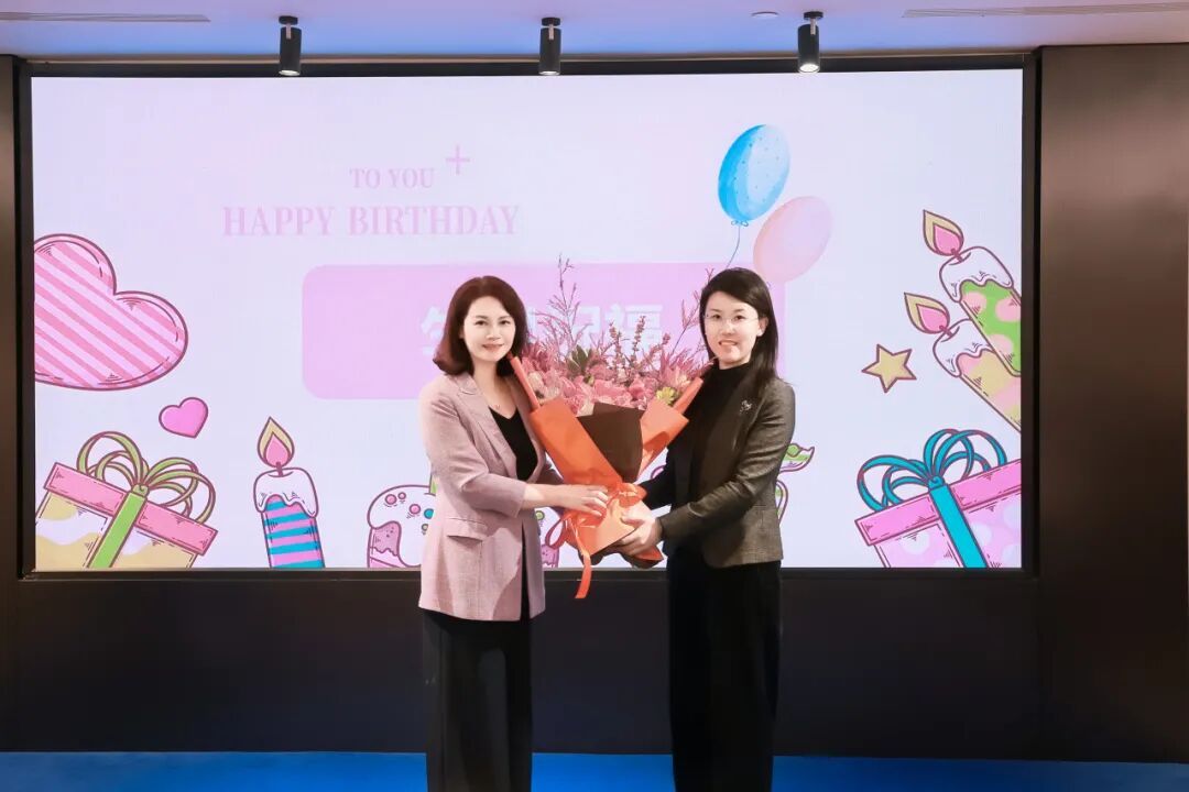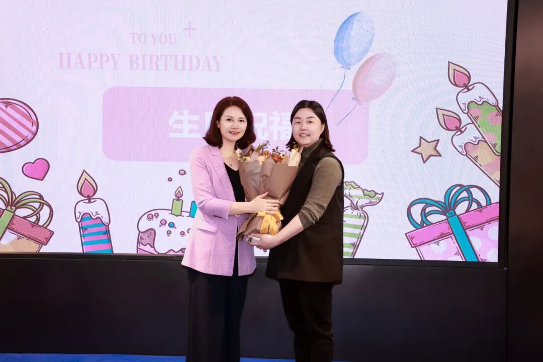 窗外或见冬寒,室内却暖意盎然。主持人邀请本月“寿星”登台。行政部小伙伴送上早已备好的生日蛋糕。蛋糕承载着最深切的祝愿,烛光映照在每个人笑意盈盈的脸上;大家送上的鲜花传达着美好的愿望,祝福每位过生日的小伙伴新的一岁生活如鲜花般绚烂,事业和家与家一同共绽芬芳。