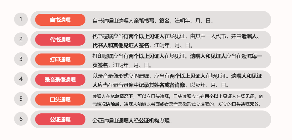 其实并不麻烦,但一定要满足实质要件与形式要件,否则可能导致遗嘱无效。遗嘱人要具备遗嘱能力,意思表示要真实,遗嘱的内容要合法,且遗嘱的形式也要正确(满足以下其中一种形式即可)。