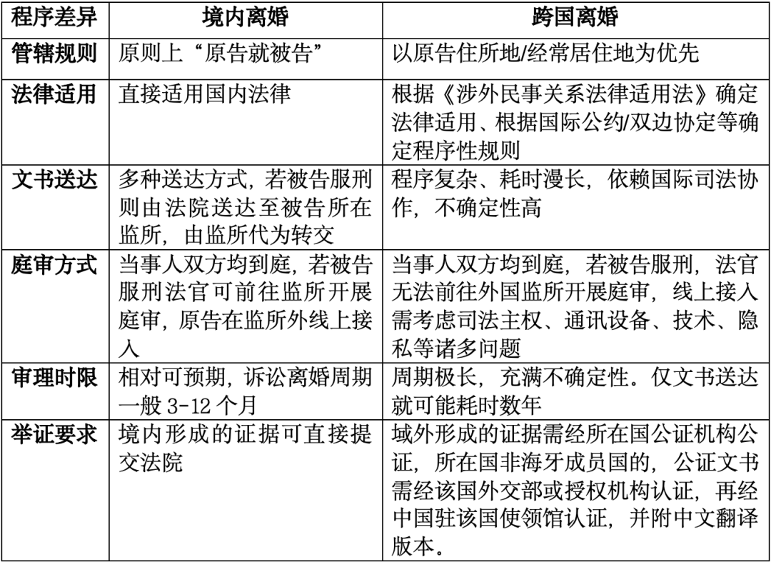 司法实践中,境内离婚与跨国离婚在程序上存在显著差异,而王暖暖诉俞某某离婚案则因被告在泰国服刑这一特殊情境,进一步凸显了跨国离婚程序的复杂与挑战。