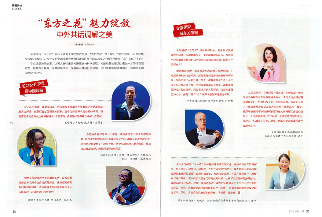 全国妇联权益部兼职副部长、上海家与家律师事务所主任谭芳律师在《中国妇女》杂志2025年12月刊专题文章《“东方之花”魅力绽放,中外共话调解之美》中表示,中国婚姻家庭纠纷人民调解工作已经迈向了一个全新的高度,它已经从一个传统的“劝和”角色,演进为一门融合了专业、温度、创新与使命的现代化社会治理艺术。