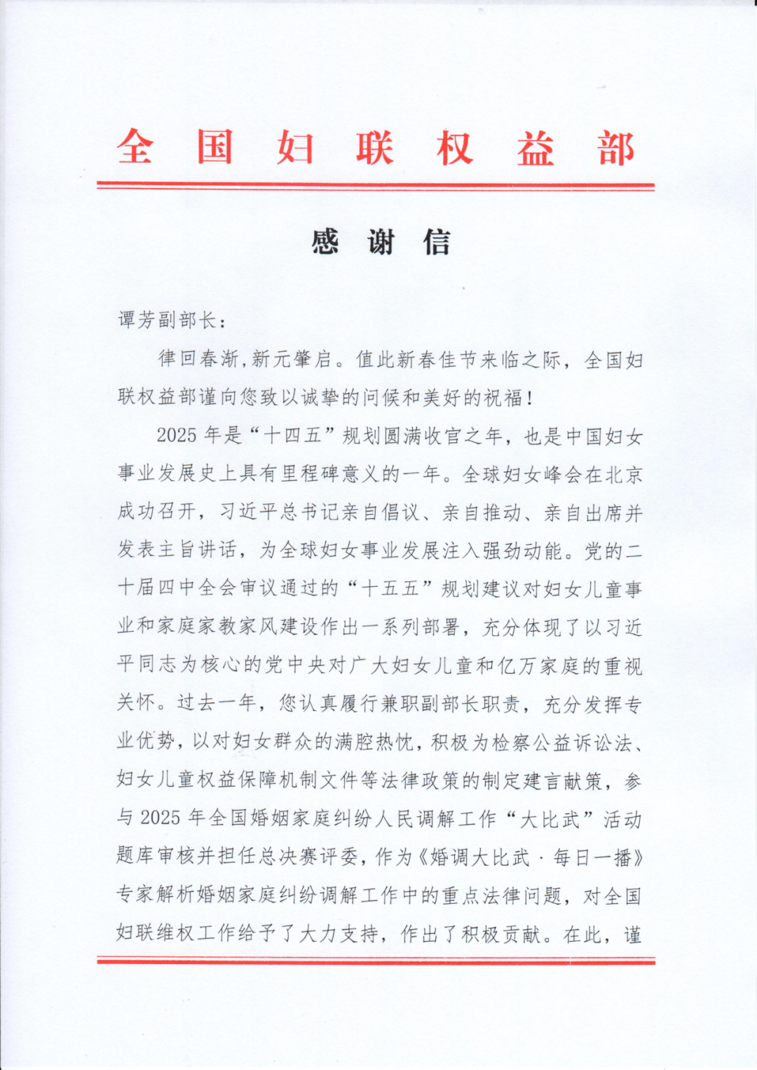 信中感谢谭芳过去一年认真履行兼职副部长职责,充分发挥专业优势,以对妇女群众的满腔热忱,积极为检察公益诉讼法、妇女儿童权益保障机制文件等法律政策的制定建言献策,参与2025年全国婚姻家庭纠纷人民调解工作“大比武”活动题库审核并担任总决赛评委,作为《婚调大比武·每日一播》专家解析婚姻家庭纠纷调解工作中的重点法律问题,对全国妇联维权工作给予了大力支持,作出了积极贡献。
