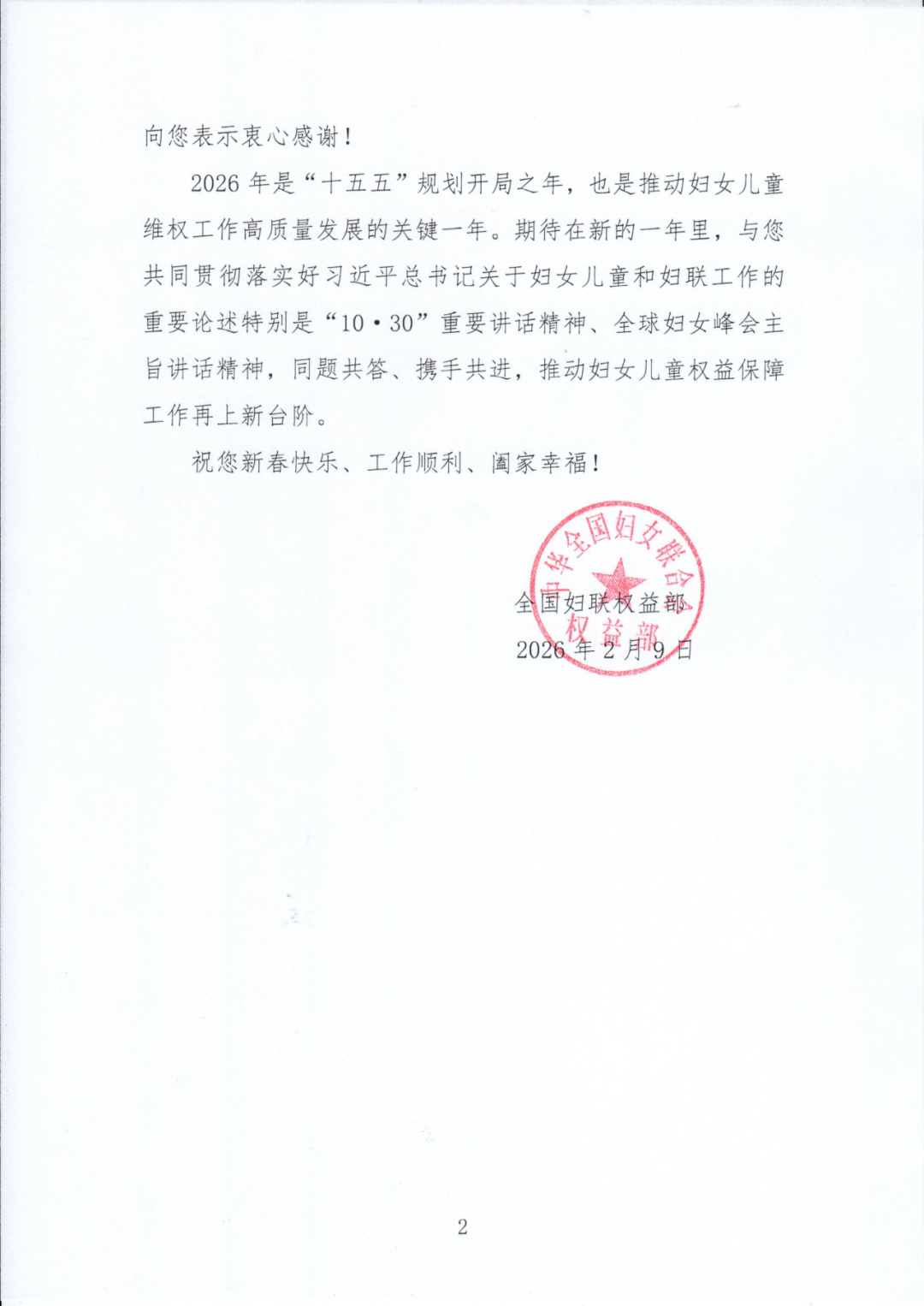 2026年2月,全国妇联权益部向全国妇联权益部兼职副部长、上海家与家律师事务所主任谭芳发来感谢信。