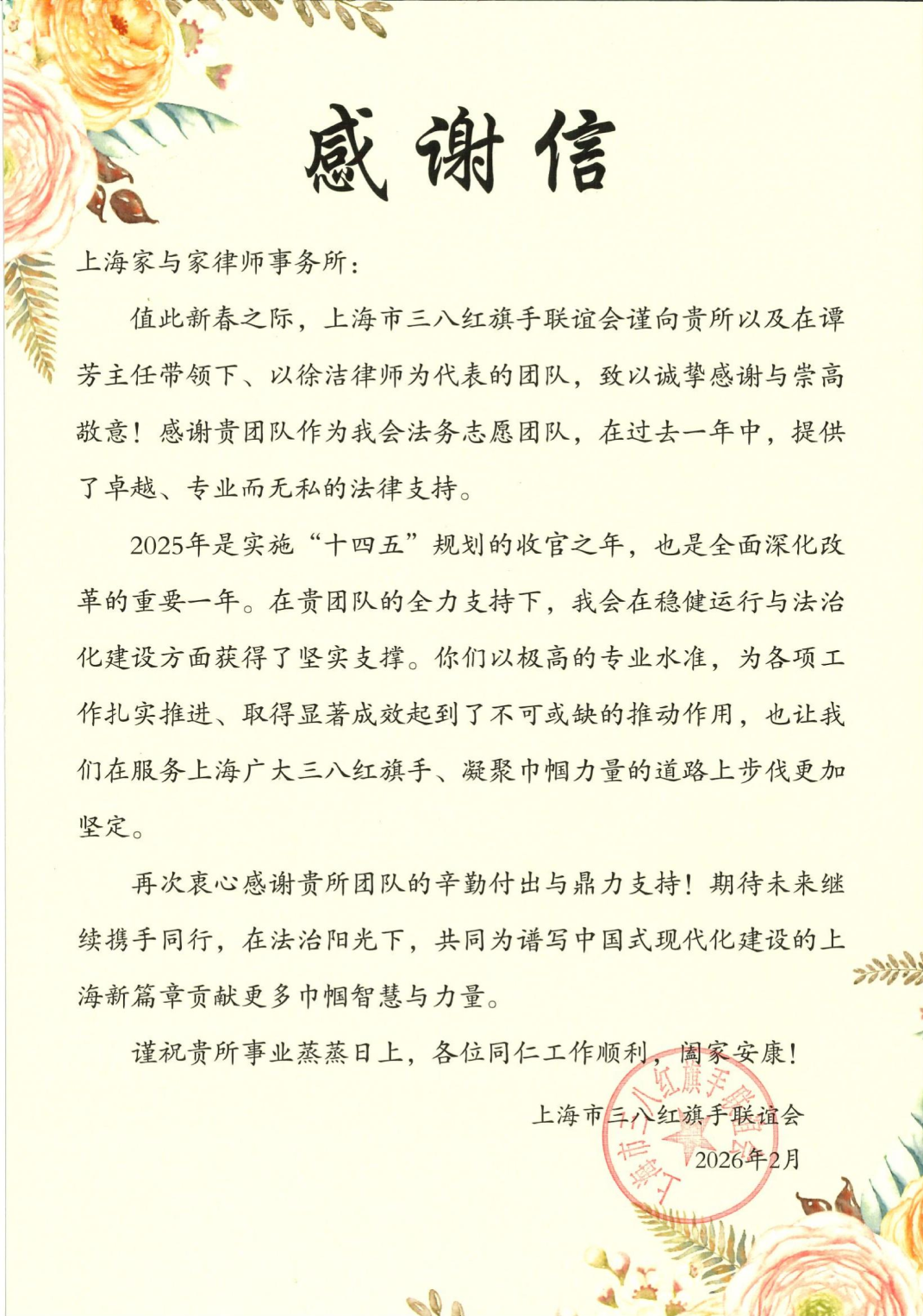 信中感谢上海家与家律师事务所主任谭芳律师,以及以上海家与家律师事务所副主任徐洁律师为代表的律师团队,作为上海市三八红旗手联谊会法务志愿团队,在过去一年中,提供了卓越、专业而无私的法律支持。