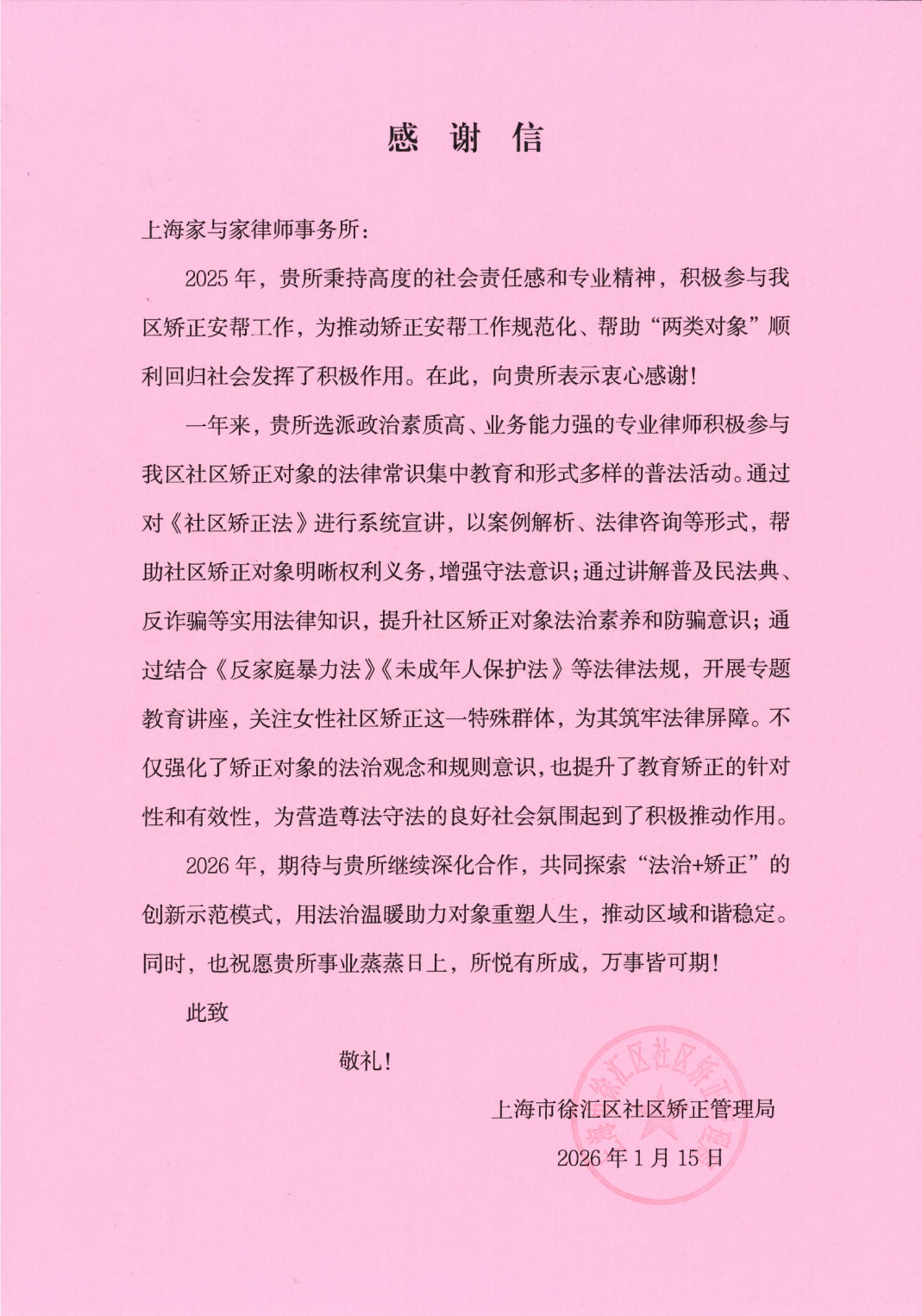 2026年1月,上海市徐汇区社区矫正管理局向上海家与家律师事务所发来感谢信。