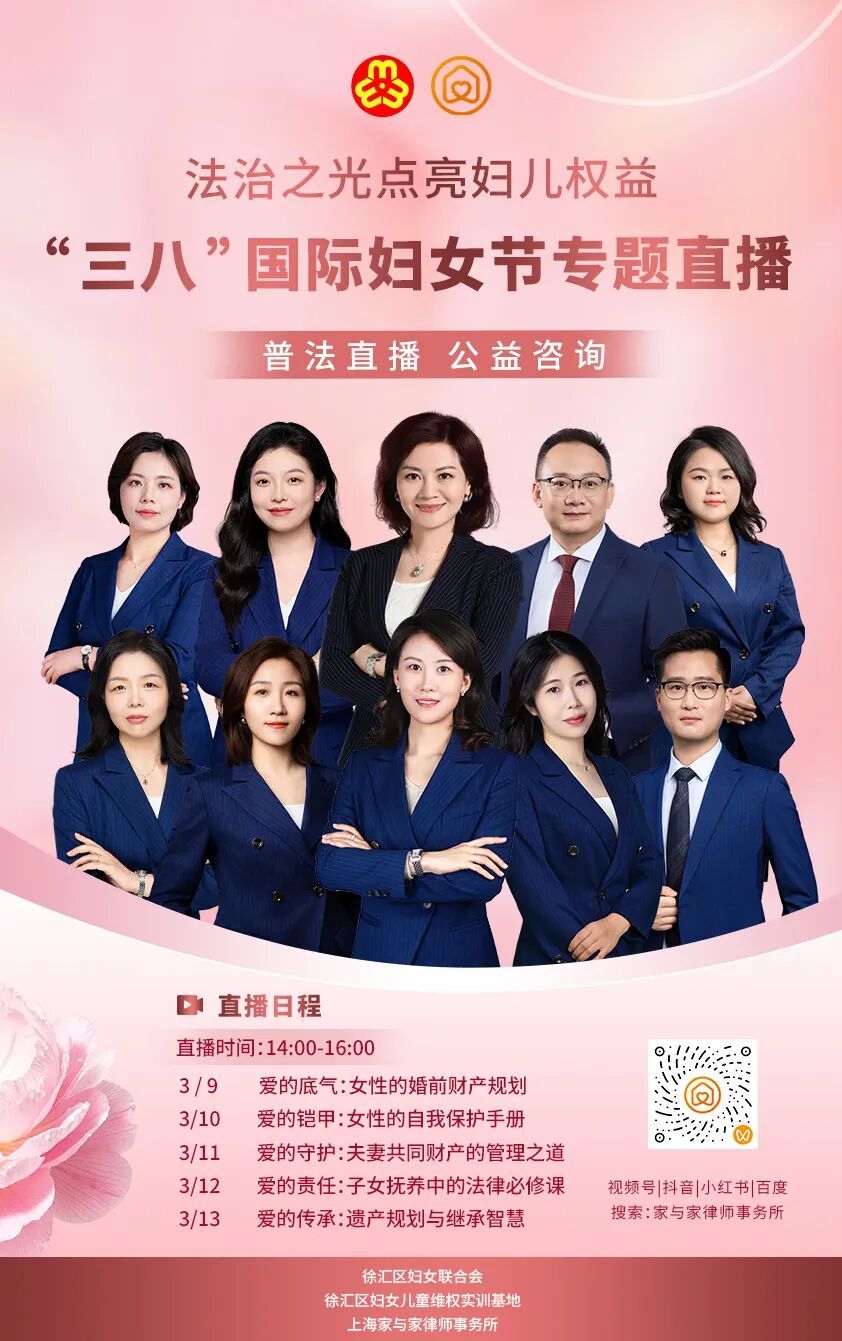 这是徐汇区妇联携手徐汇区妇女儿童维权实训基地、家与家律师事务所,推出的妇女权益保障专题系列直播活动。作为徐汇区妇联妇女节系列活动的重要组成部分,本次直播以女性全生命周期为脉络,聚焦婚前财产规划、遗产传承、自我保护及家庭责任等核心议题。家与家律师团队将专业法律知识转化为接地气的实用指南,用生活化的案例解析与通俗化的语言表达,帮助女性群体在人生各重要阶段都能明晰权益边界、掌握维权方法,以法律智慧为自身成长与家庭幸福保驾护航。