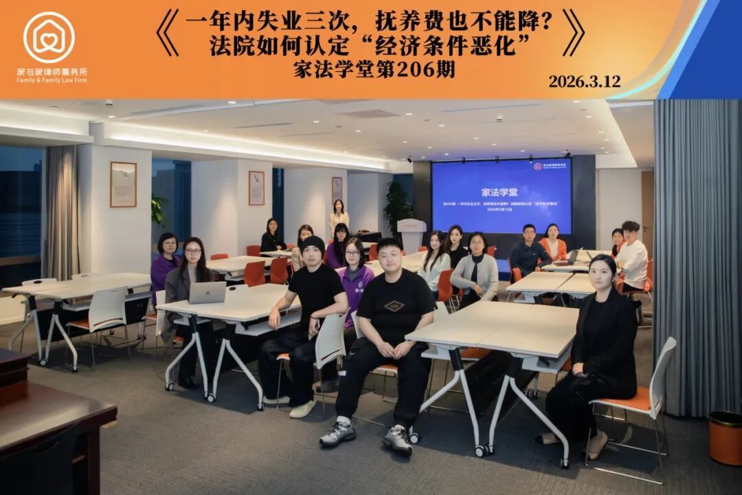 3月12日,上海家与家律师事务所举办第206期家法学堂活动。本期内训以《一年失业三次,抚养费也不能降?法院如何认定“经济条件恶化”?》为主题,聚焦抚养费纠纷中“经济条件恶化”的司法认定展开,主讲人为徐汇区女律师联谊会理事、上海家与家律师事务所高级合伙人朱一菲律师。