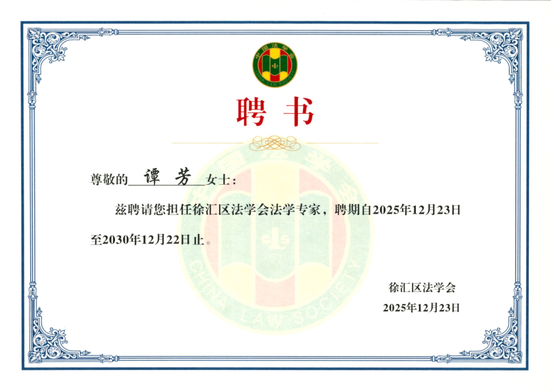 此前,上海市徐汇区法学会聘请上海家与家律师事务所主任谭芳律师担任“徐汇区法学会法学专家”,聘期5年。