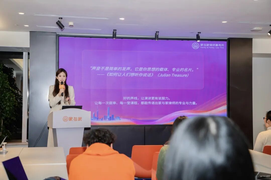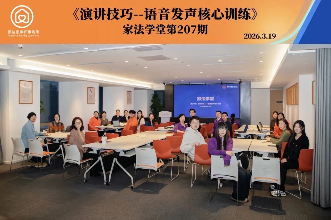 3月19日,上海家与家律师事务所举办第207期家法学堂活动。本次内训以“演讲技巧——语音发声核心训练”为主题,由家与家律师事务所蒋典希担任主讲人,围绕律师日常工作场景中的声音运用,帮助家与家律师打造更具权威感与信任度的“声音名片”。