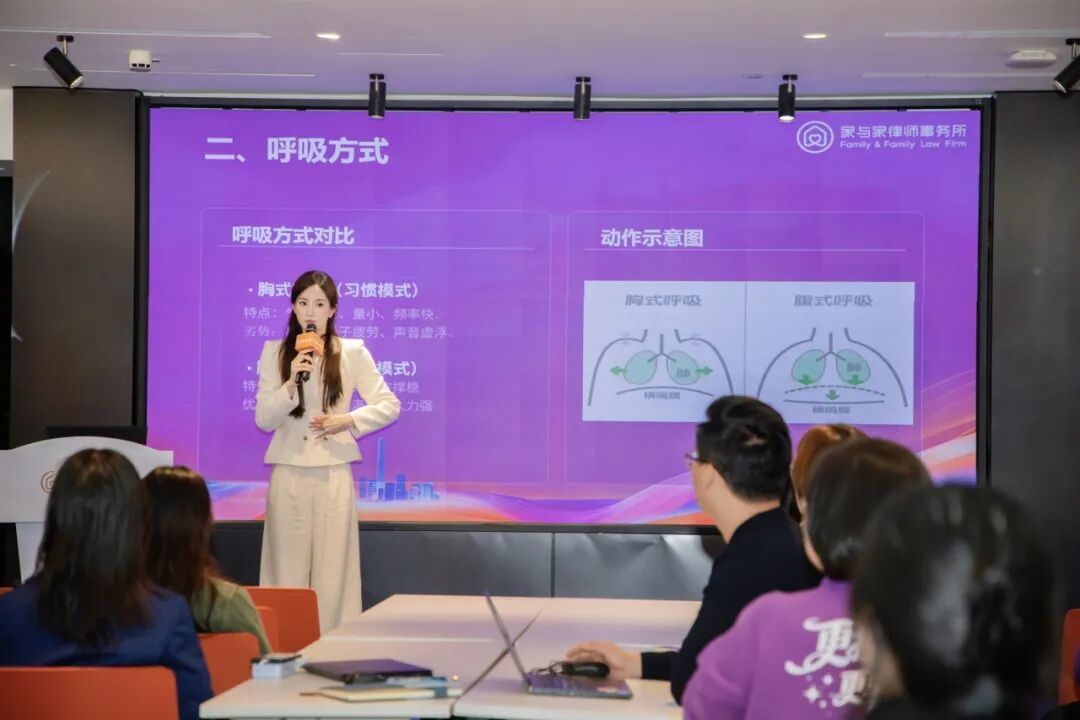 通过“胸腹联合式呼吸”的科学训练,帮助在场律师掌握用气息支撑声音的技巧,实现声音的稳定支撑。