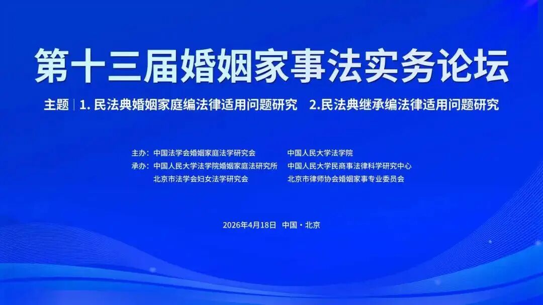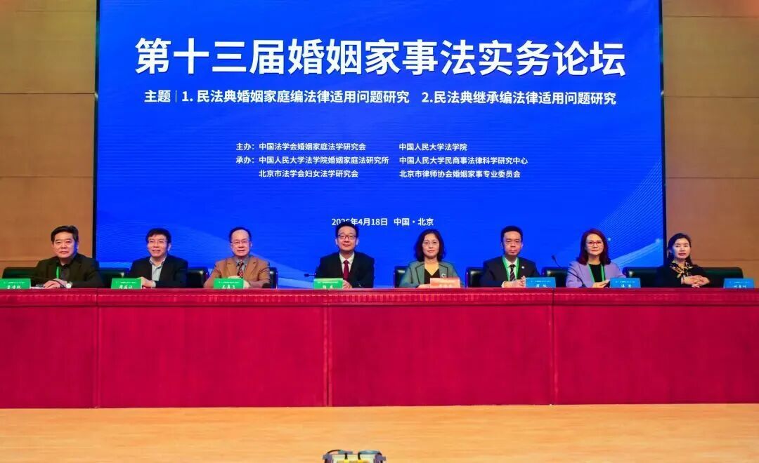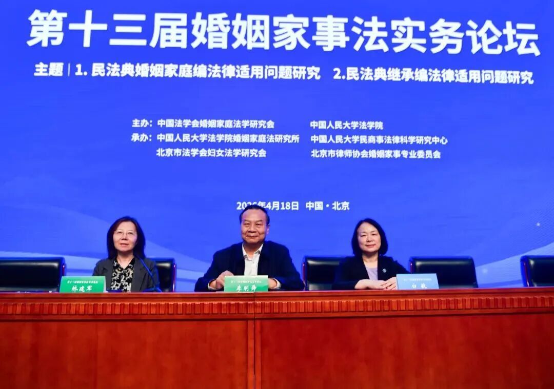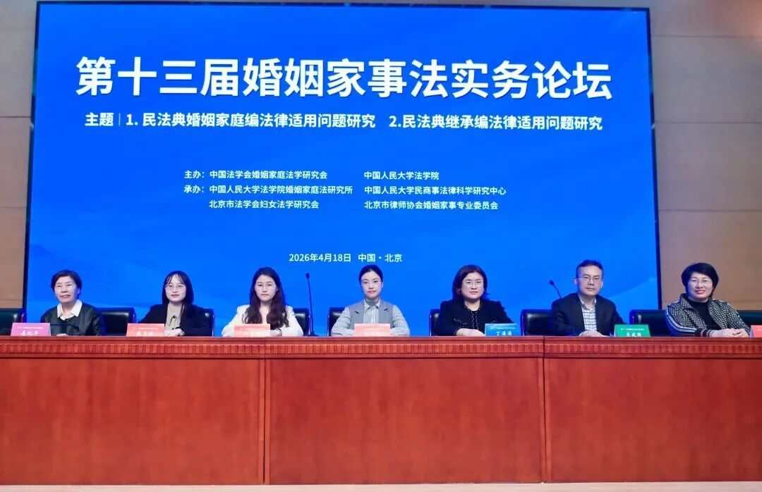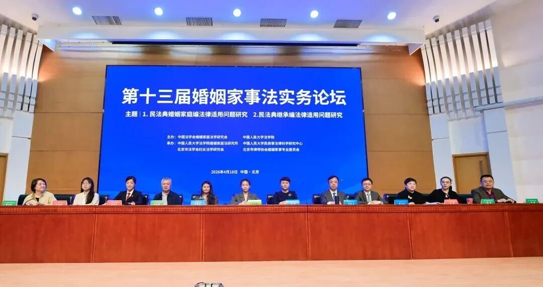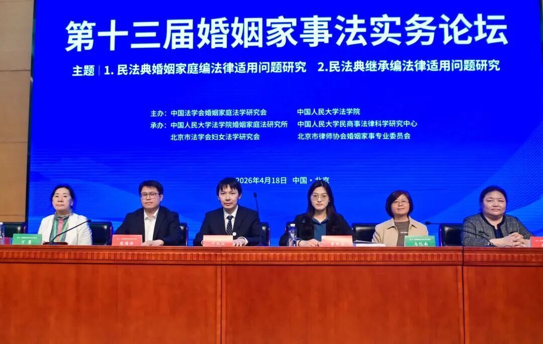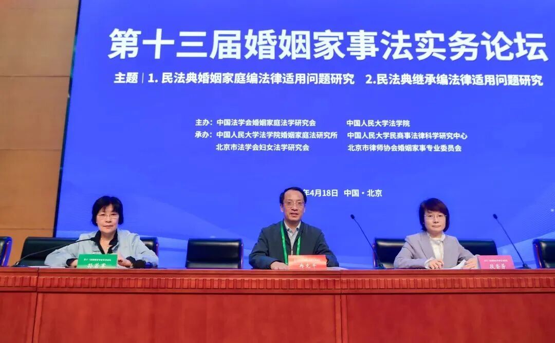 本报讯(记者 林子杉)4月18日,第十三届婚姻家事法实务论坛在中国人民大学逸夫会堂举行。论坛由中国法学会婚姻家庭法学研究会、中国人民大学法学院主办,中国人民大学法学院婚姻家庭法研究所、中国人民大学民商事法律科学研究中心、北京市法学会妇女法学研究会、北京市律师协会婚姻与家事法律专业委员会承办。